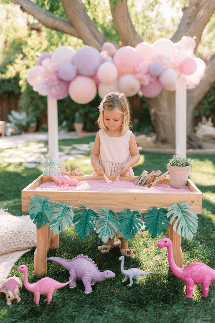 The pink sand is genuinely the detail that makes this station so magical for little girls — the sensory texture is endlessly entertaining, and the pastel dino figurines nestled throughout give little hands something to find, collect, and play with for the entire party. For slightly older guests, add a simple dino egg hunt nearby with small plastic eggs hidden in the grass, each one containing a mini dino figurine to take home.