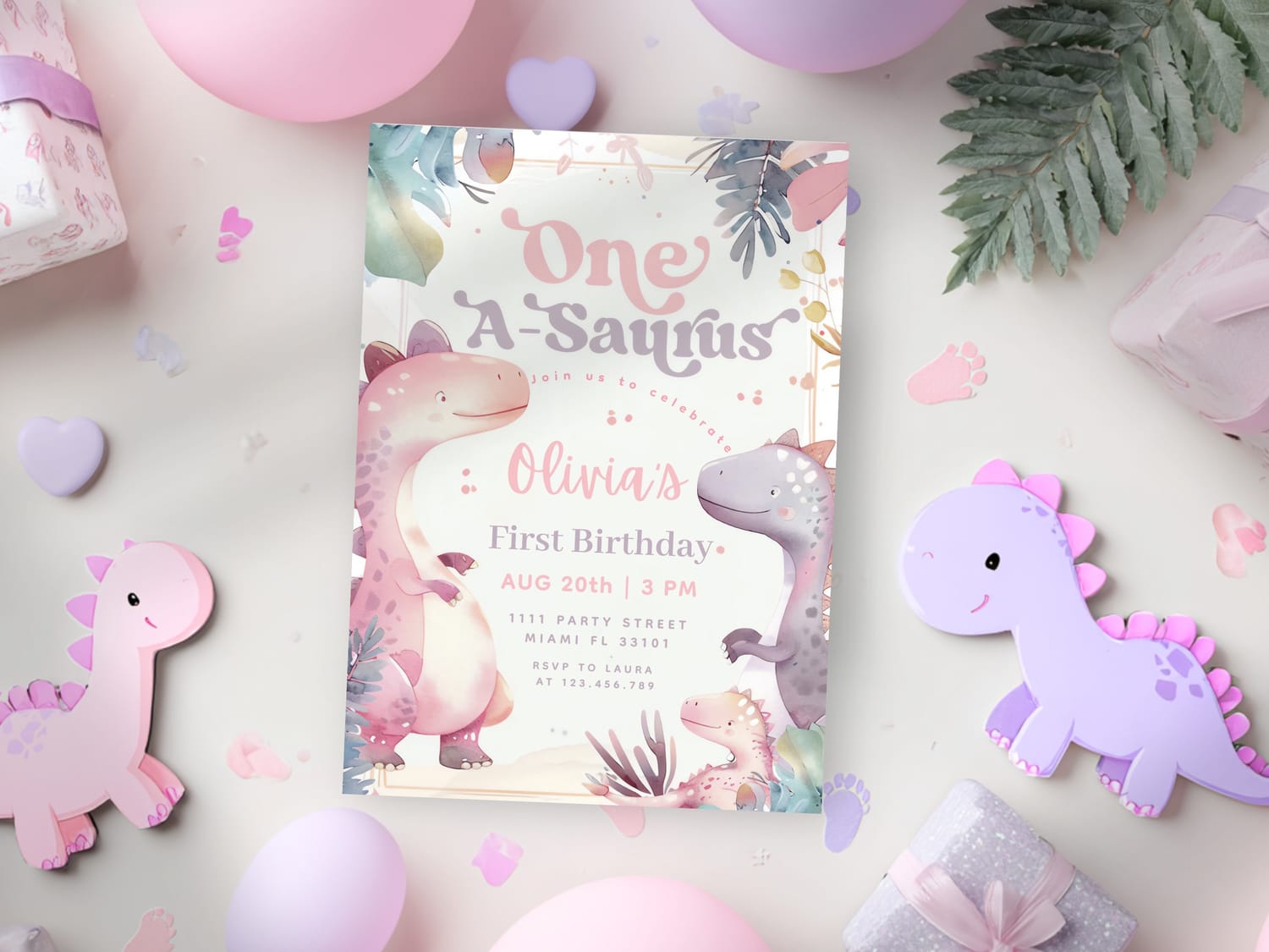 Your little girl is turning one — and she is absolutely One A-Saurus. This first birthday theme takes everything wonderful about the classic dinosaur party and wraps it in the softest, most feminine palette imaginable: blush pink, lavender, mint green, and peach, with the most adorable watercolor dino characters that feel playful and sweet without losing a single bit of that birthday magic. The result is a party that feels completely unique, genuinely beautiful, and utterly perfect for a little girl who was born to be a little wild.