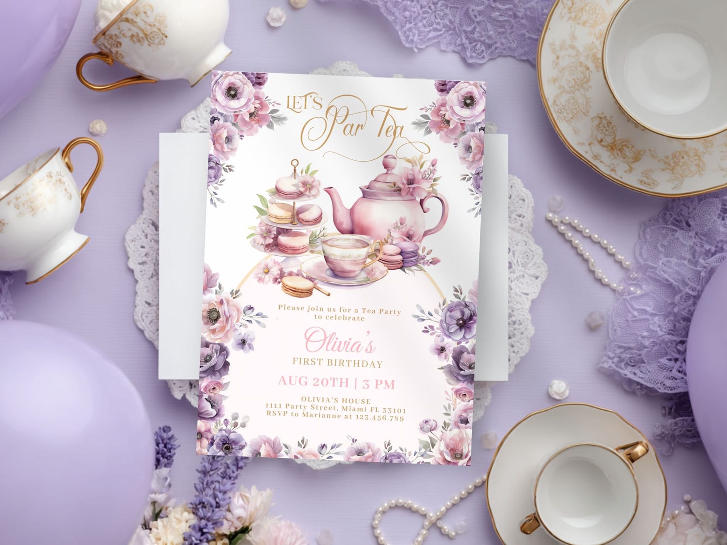 The fully editable version of this Let's Par-Tea invitation is available in our Etsy shop — customize it with your birthday girl's name and details, print, and let the tea party begin.