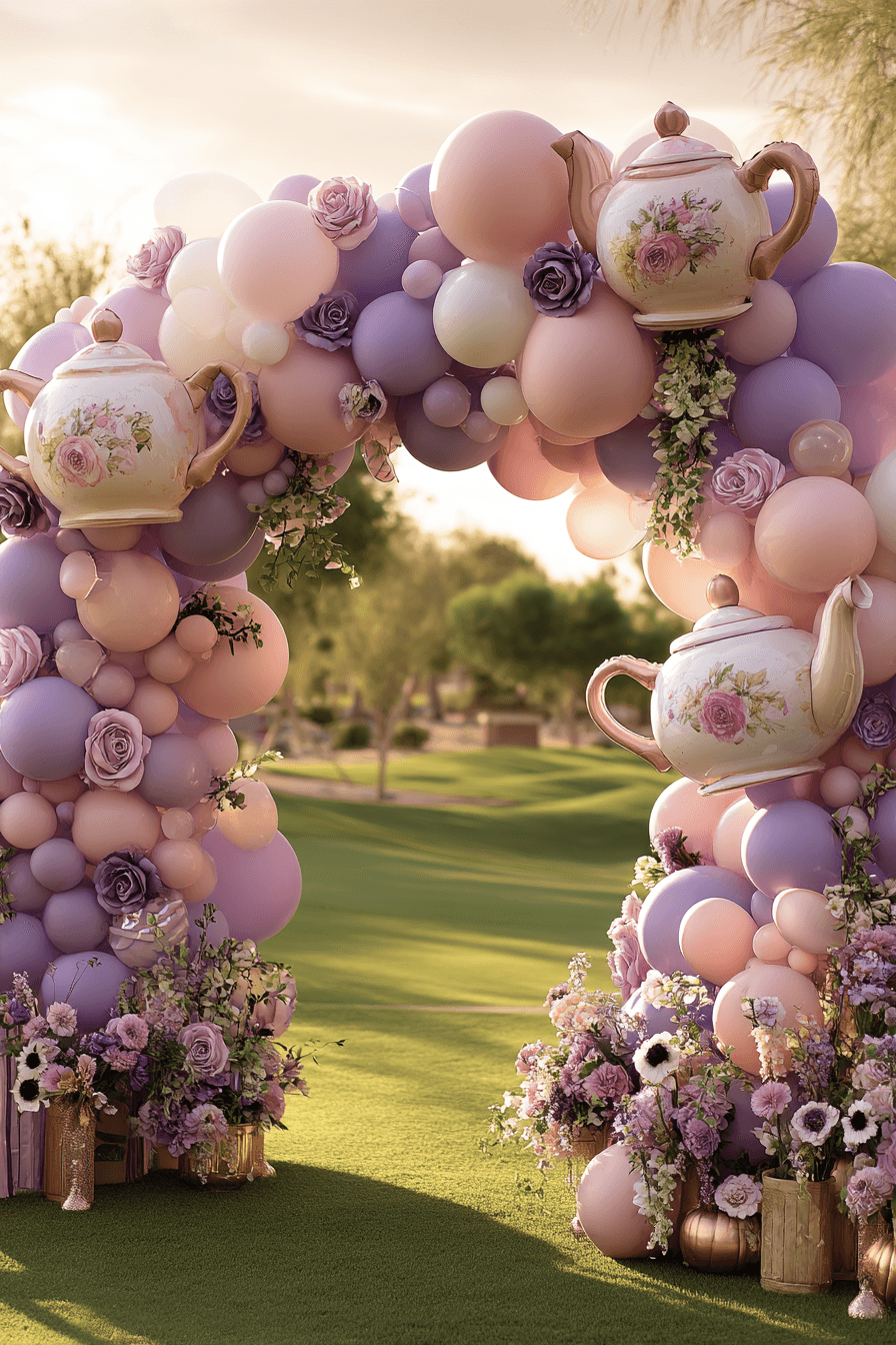 The balloon arch for this Par-Tea party is one of the most enchanting, romantic decor installations in any children's party theme. The arch itself is a full organic arrangement in dusty lavender, soft pink, blush, and cream, with clusters of pink roses and trailing ivy woven throughout for that garden-party botanical texture. The whole installation is set on a manicured green lawn at golden hour, with warm light filtering through the trees and lush floral arrangements nestled at the base of each column. It creates a visual that is genuinely magical — the kind of party entrance that makes every guest stop in their tracks.