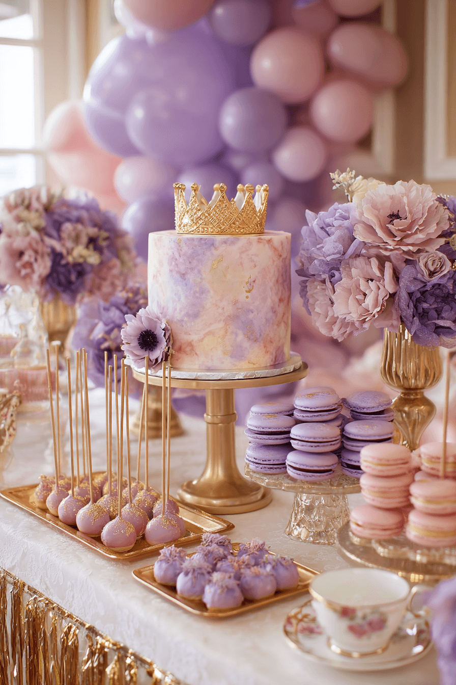 The dessert table for this Par-Tea party is opulent, layered, and absolutely stunning — it belongs in a tea room at the finest hotel in the world. The centerpiece is a single-tier watercolor cake in soft pink and lavender marble tones, topped with a gold crown and a single purple anemone bloom, elevated on a tall gold pedestal stand surrounded by sweeping arrangements of lavender peonies and purple roses in vases on either side. Rows of lavender cake pops with gold dust line a gold tray on one side, and tiered clear stands hold towers of lavender and pink macarons on the other. Lavender truffle balls dusted with purple sugar sit in neat rows at the front of the display.
