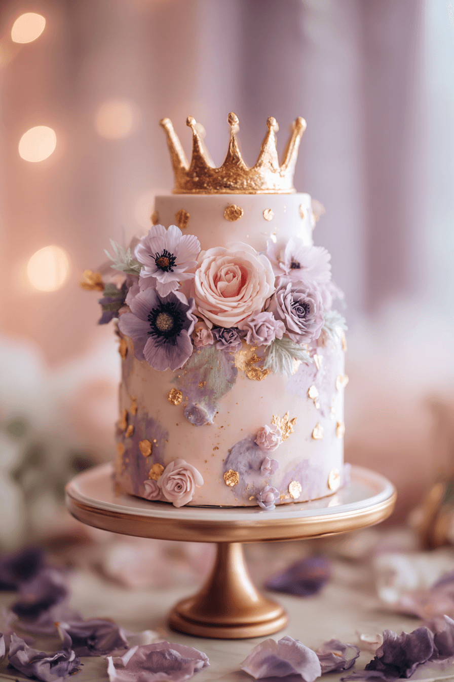 This is one of the most genuinely regal birthday cake designs in the girls' party world, and what makes it so extraordinary is the combination of the painted texture and the sculptural sugar flowers — two techniques that work in perfect harmony. When briefing a baker, ask for a watercolor buttercream technique in lavender and blush, hand-sculpted sugar flower cascade, and a gold fondant crown topper. Show them the inspiration image and trust them to translate it — a skilled baker will absolutely love this brief and run with it.
