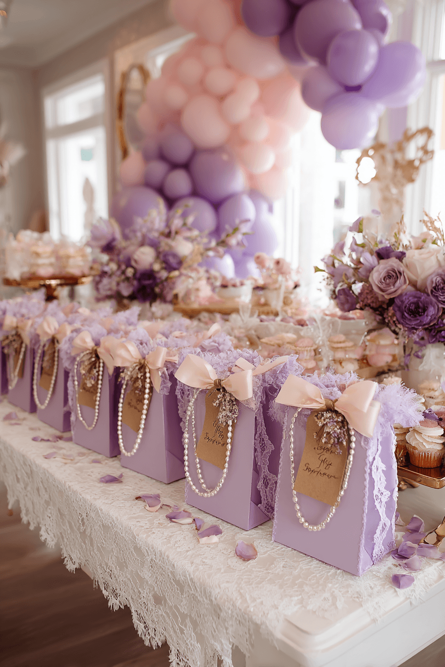 The favor bags for this Par-Tea party are some of the most gorgeous for a girls' birthday — lavender gift bags dressed with white lace trim along the edges, a wide blush satin bow, pearl bead handle chains, and a handwritten kraft tag tied with dried baby's breath. Lined up along a white lace tablecloth with lavender and blush rose arrangements at either end and a balloon garland above, they form the most enchanting little favor display that guests will absolutely light up over when they see it.