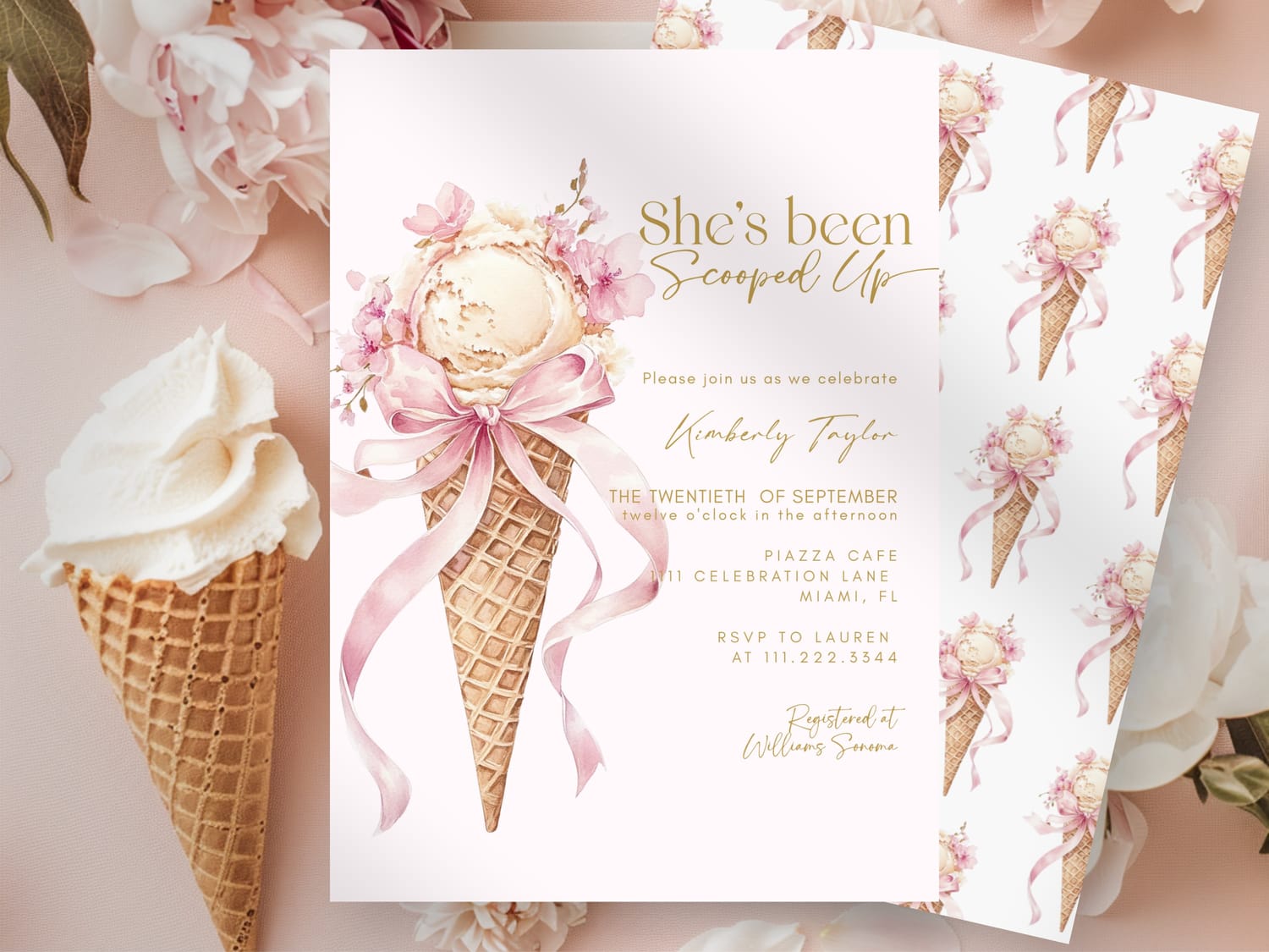 Your ice cream bridal shower invitations set the tone for the entire event. For this theme, playful yet polished is the way to go. Think pastel watercolor illustrations of cones, sprinkles dancing across the page, or elegant typography paired with whimsical graphics of sundaes and ice cream trucks. A scalloped edge card that mimics a cone’s texture? Adorable.