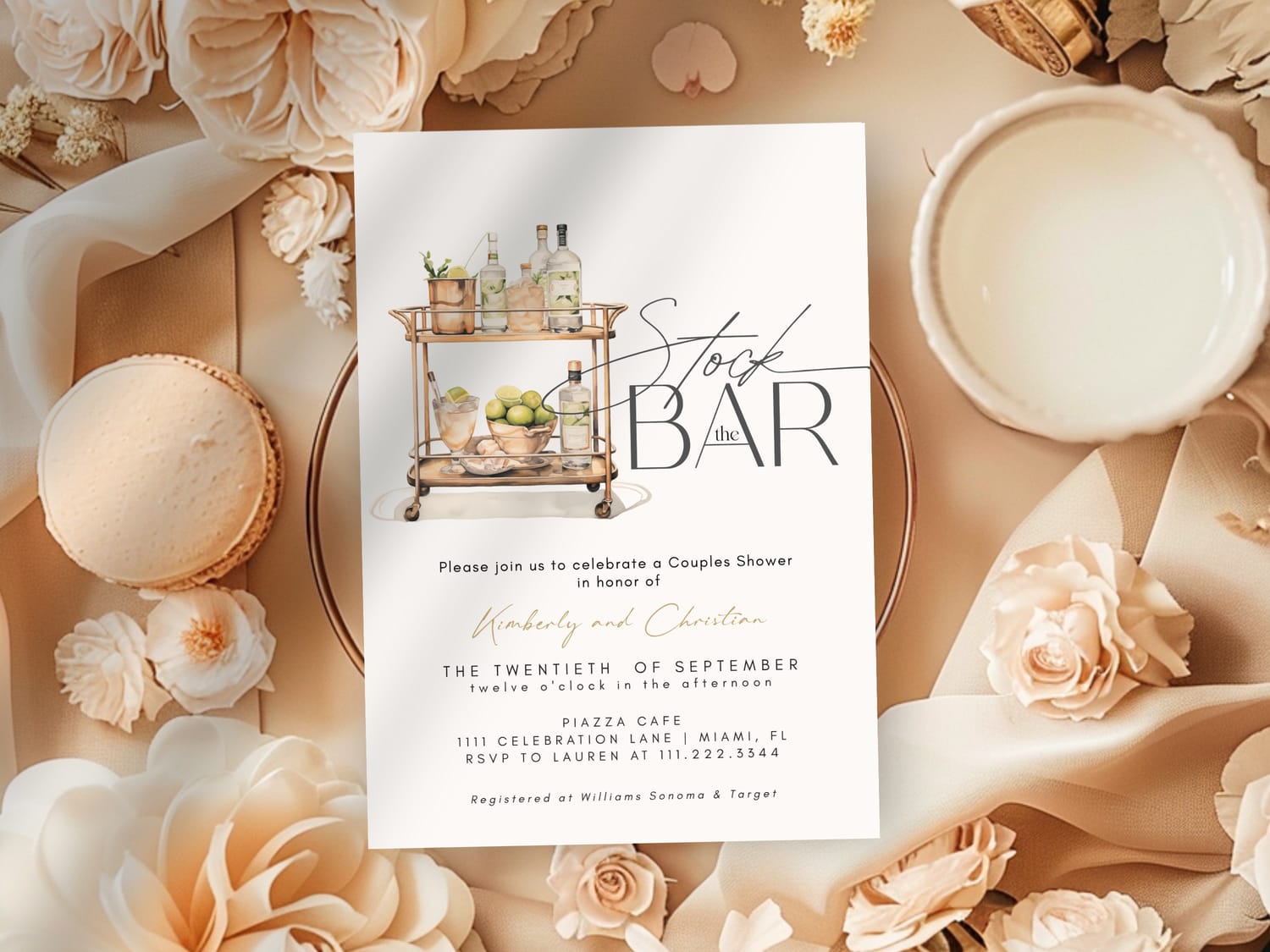 [Invitation Flatlay Placeholder] Caption: Elegant flatlay of Stock the Bar shower invitations with gold accents.
