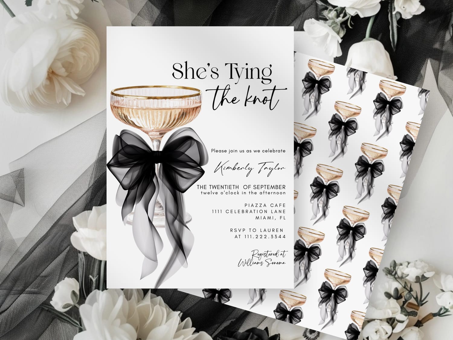 “Black, white, and tied with love—join us for [Bride’s Name]’s bridal shower.”